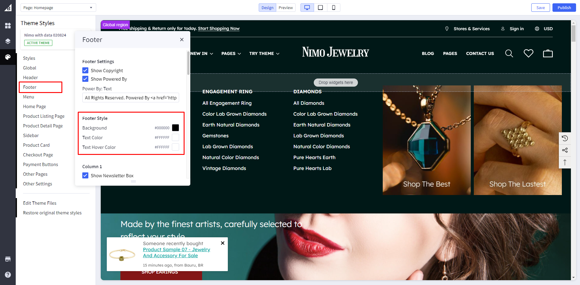 In the **Theme Editor** -> go to **Footer** / **Footer Style**