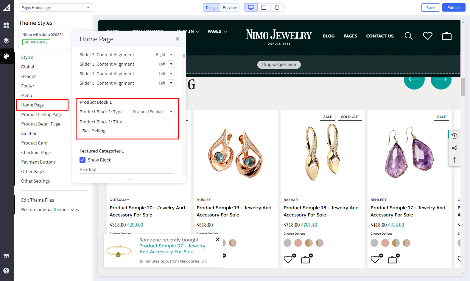 In the **Theme Editor** -> Go to **Home Page** / **Product Block 1**