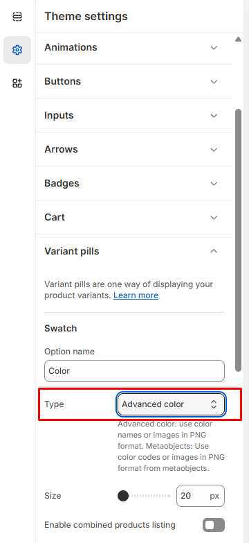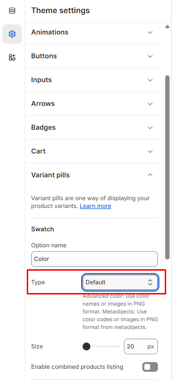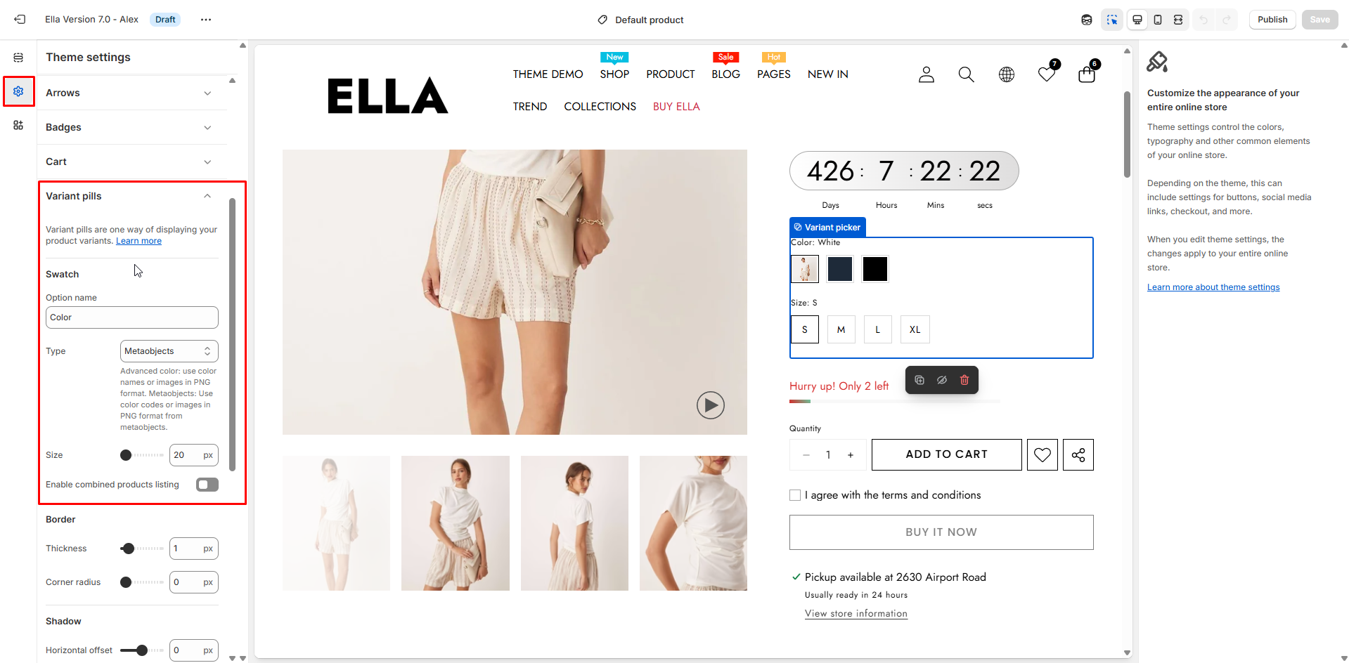 Ella 7 offers 3 type for Color Variant: Default, Advanced Color and Metaobject.