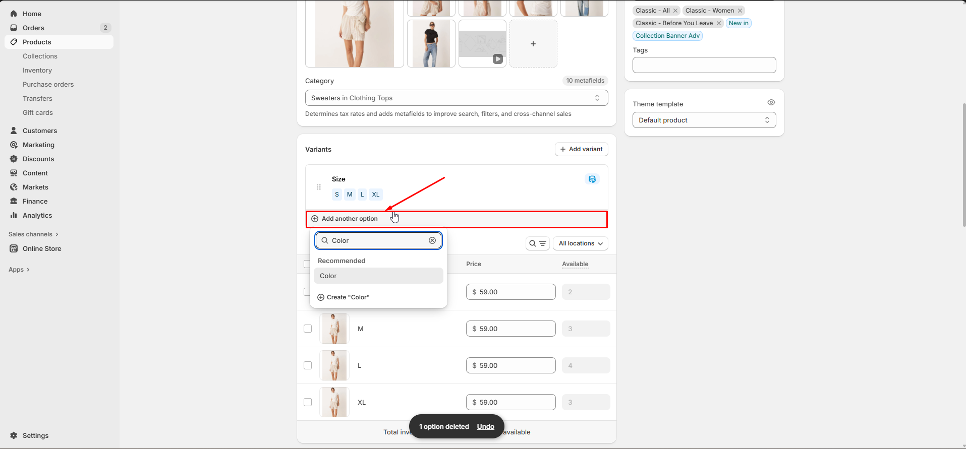 4. In the **Variants** section, click **+ Add options like size or color.**