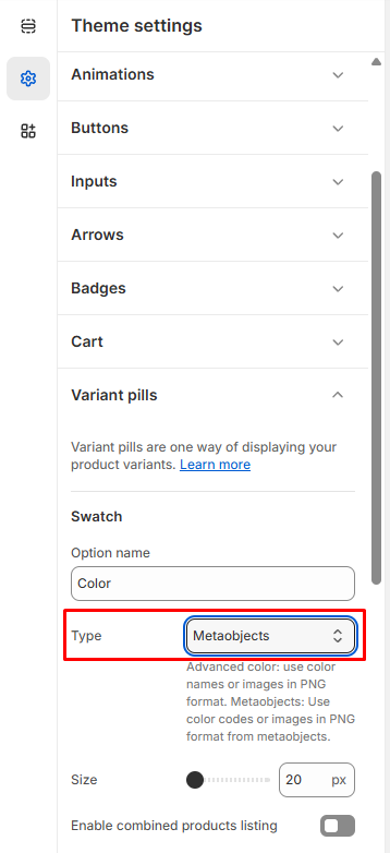 * Scroll to **Swatch** and choose **Type** as **Metaobjects.**