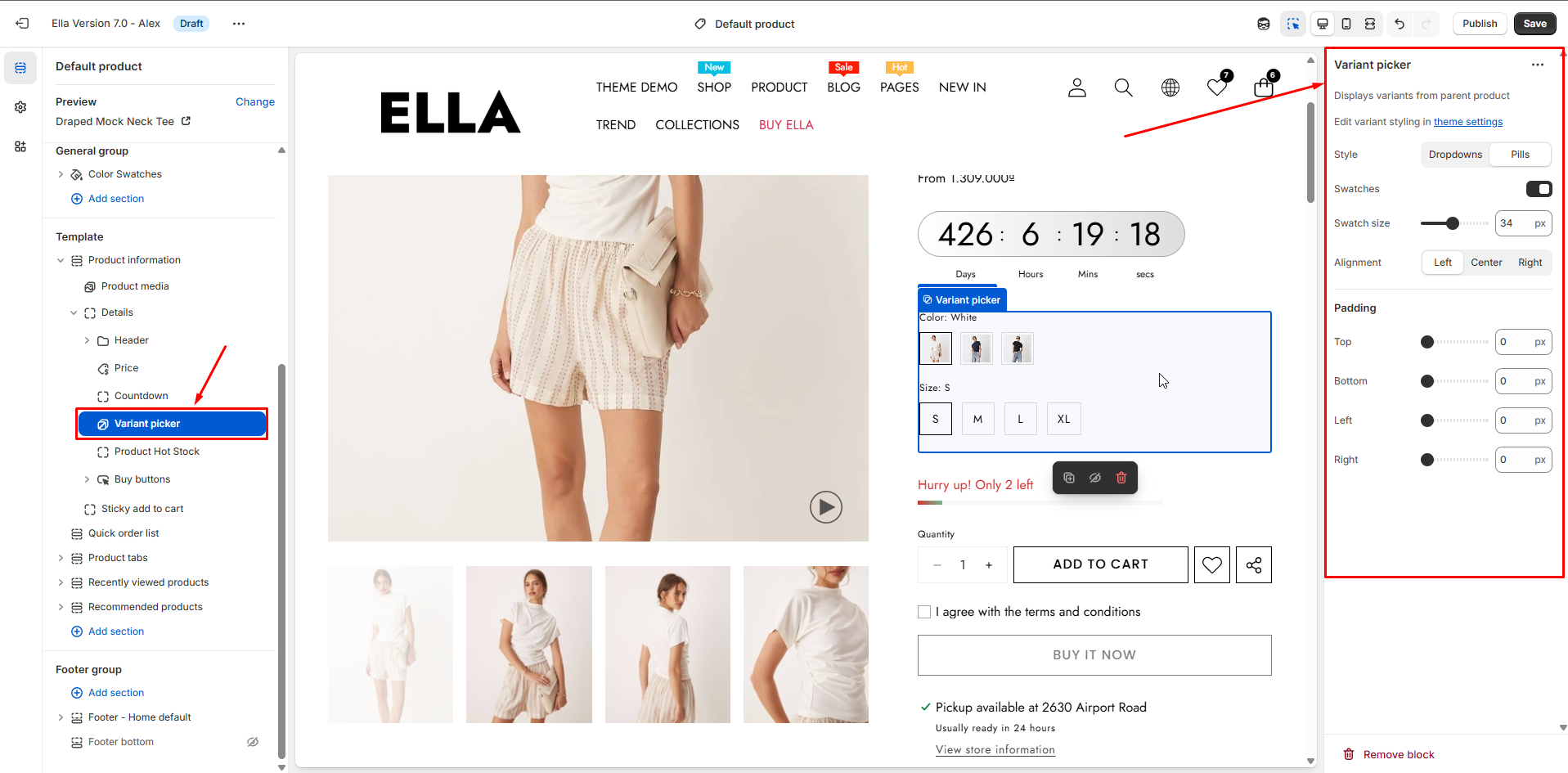 * In the **Details** block, find the Variant Picker Block (if not found let add it).