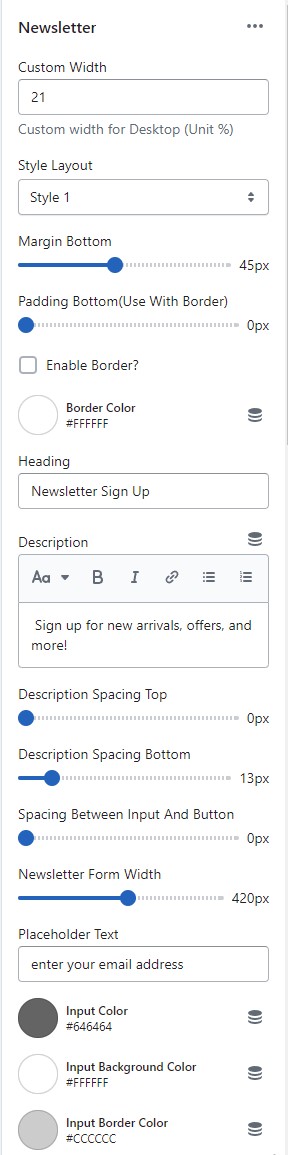 * The settings are for the block width, title, description, button text along with their colors, spacing, background color.&#x20;