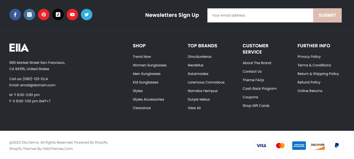 <figure><img src="https://3284033180-files.gitbook.io/~/files/v0/b/gitbook-x-prod.appspot.com/o/spaces%2Fag3h7ZduRGWlquTgGUHi%2Fuploads%2FI6w3WsDFoqeQ6KWWzf1l%2Ffooter-22.jpg?alt=media&#x26;token=1930df9b-6370-4630-8c2a-8c936305b9b6" alt=""><figcaption><p><a href="https://new-ella-demo-11.myshopify.com/?fts=0&#x26;preview_theme_id=124305637427">Home 22 - Eyes Wears</a></p></figcaption></figure>