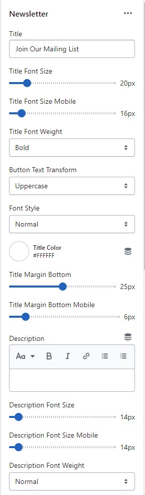 ► In the **Newsletter** section settings. Add or adjust **Newsletter** block as your need: