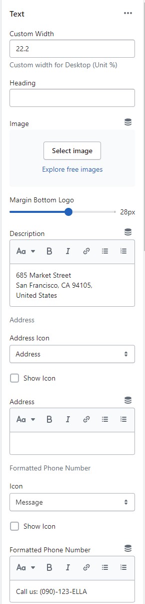 1. **Text** block: Limit 2. The block allows you to upload logo image, address, phone and emails with icons.