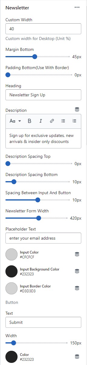 * The settings are for the block width, heading, description, button text along with their colors, spacing, background color.&#x20;