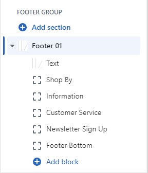 ► In the **Footer 01** section settings. Add or adjust these blocks as your need: