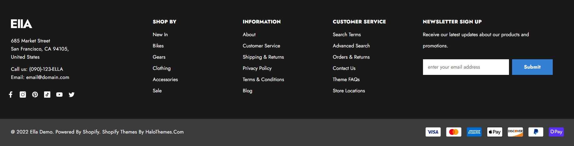 <figure><img src="https://3284033180-files.gitbook.io/~/files/v0/b/gitbook-x-prod.appspot.com/o/spaces%2Fag3h7ZduRGWlquTgGUHi%2Fuploads%2FWPr2c5mrfUsfoBwEq0Rw%2Ffooter-24.jpg?alt=media&#x26;token=5e499f48-664f-4756-a54a-30dd1c78fabd" alt=""><figcaption><p><a href="https://new-ella-demo-11.myshopify.com/?fts=0&#x26;preview_theme_id=124314583091">Home 24 - Bicycle</a></p></figcaption></figure>