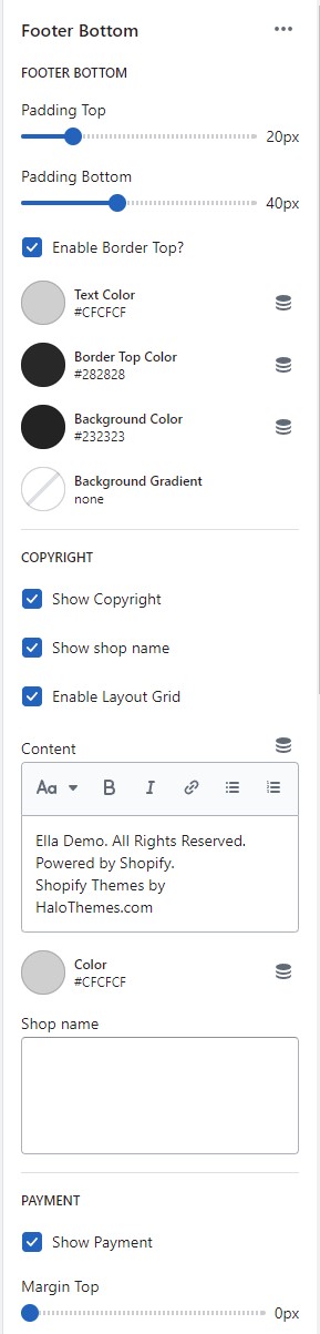 4. **Footer Bottom** block: Limit 1. The settings are for copyright and payment methods with their positions choice.