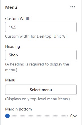 1. **Menu** block: Limit 4. The settings are for the block width, heading, and menu selection for menu.