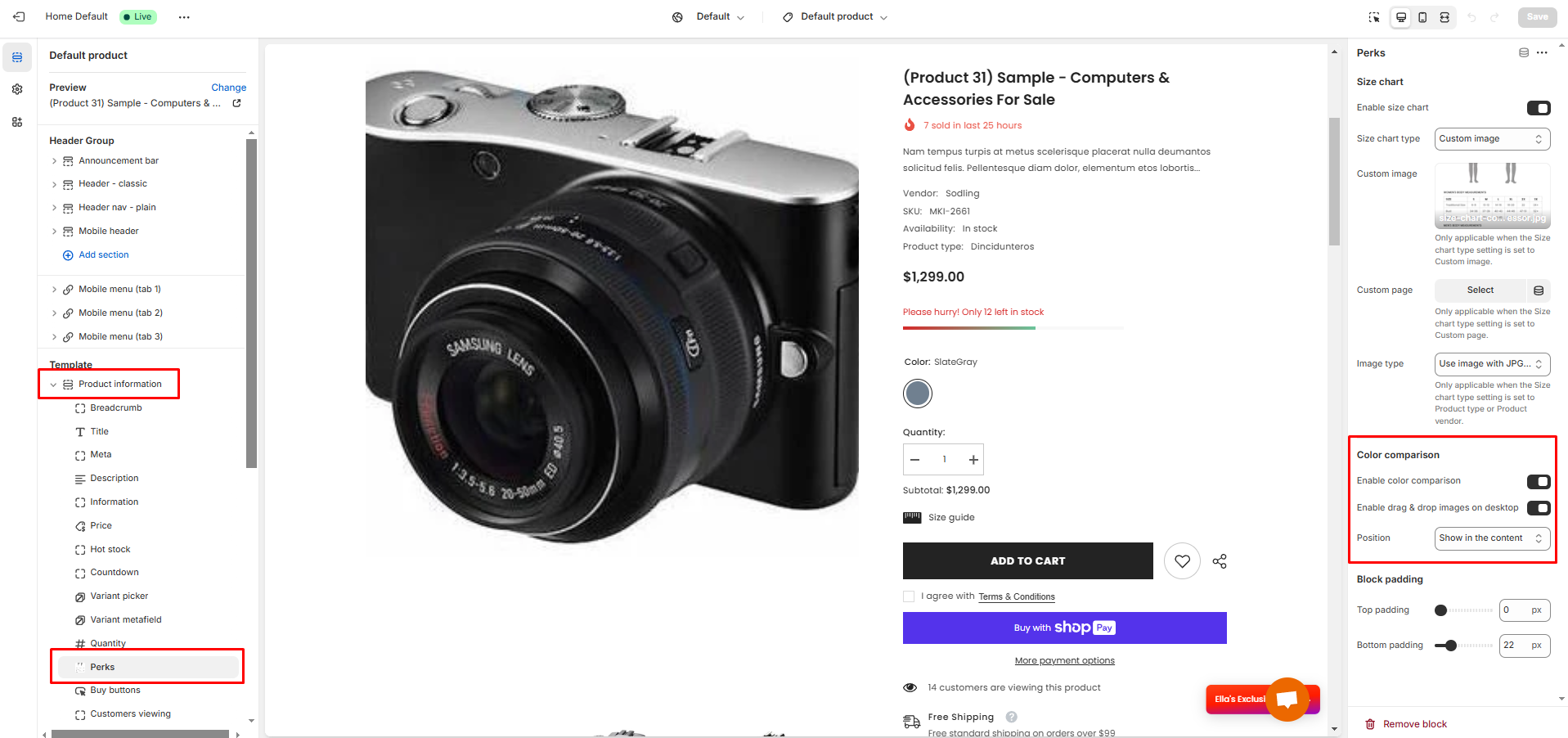 4. From **Product information ->** Click **Add block** -> Choose **Perks**.