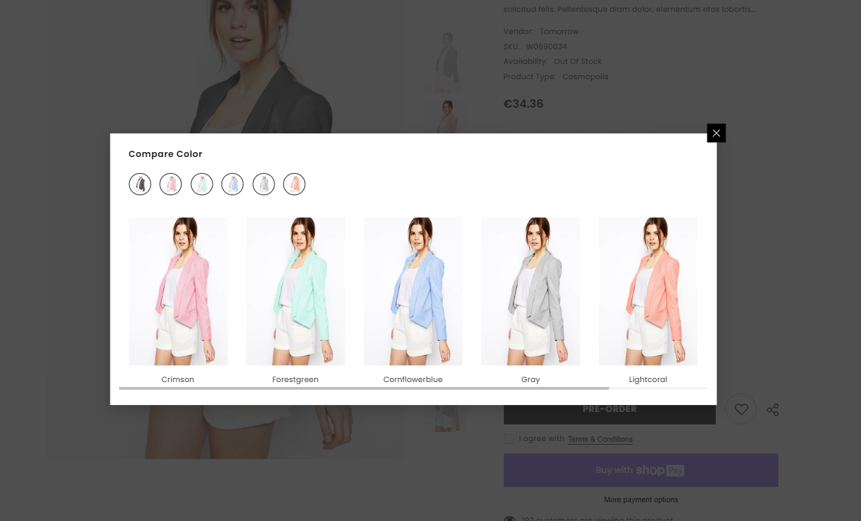 **Color Comparison** provides your customers a visual look and comparison between many colors of a product. After that, they can easily make a purchase decision and be satisfied more with the choice.