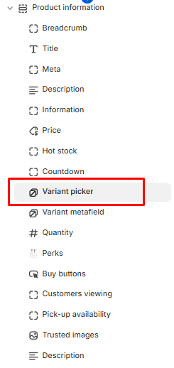 5. From **Product information ->** Click **Add block** -> Choose **Variant picker**.