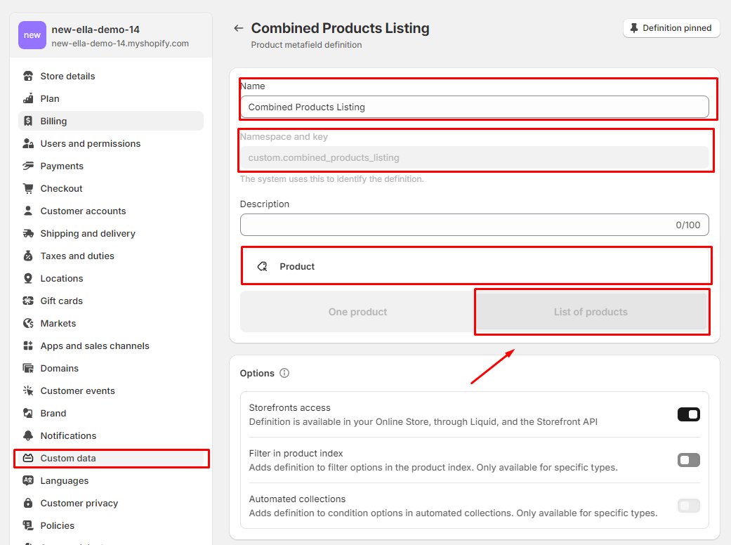 1. &#x20;From your Shopify admin, go to **Settings** -> **Custom Data**.