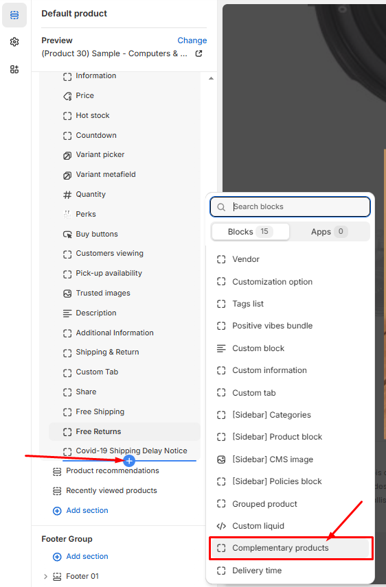 4\. From **Product information ->** Click **Add block** -> Choose **Complementary products.**