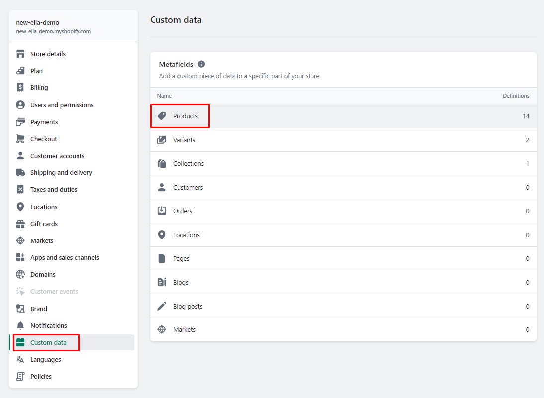 1. From your Shopify admin, go to **Settings** -> **Custom data**.