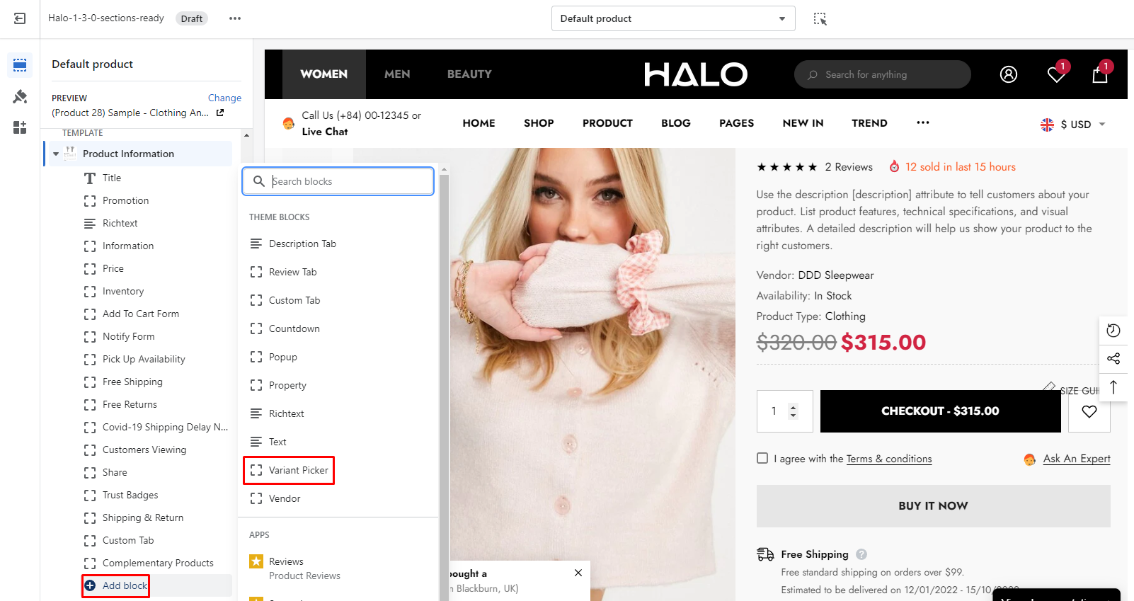 2. Click **Add block** and choose "**Variant Picker**".